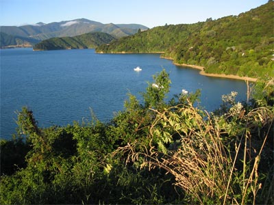 Von Picton fuhren wir über den Queen Charlotte Drive – definitely a scenic drive! – Richtung Havelock und bogen dann auf den Landzipfel zwischen Kenepuru und Charlotte Sound ab. Wow, ich glaube das ist eine der kurvigsten Straßen Neuseelands und dank nicht vorhandener Servo-Lenkung war diese Fahrt das reinste Muskeltraining! Wir schafften es sogar den Cowshed Campground, kurz vor Portage und direkt am Kenepuru Sound, noch im Hellen zu erreichen. Hmmm, frischer Salat und Räucherlachs bei herrlichem Ausblick: